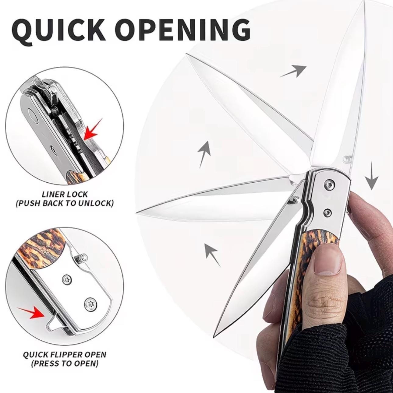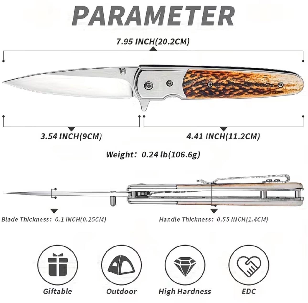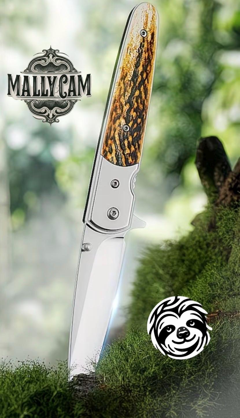 The handle is meticulously crafted from resin material to mimic deer antler , offering a perfect blend of luxury and comfort. The knife has a user-friendly design ensures a secure grip, allowing for precision in every cut. Whether you're on a hunting expedition or simply adding to your collection, this folding knife stands out as a symbol of